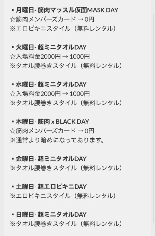 - 筋肉割¥800/ジム割1300円/投稿割1500円/早遅割1300円/通常¥2000